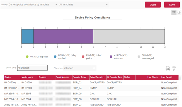 Use this dashboard to locate templates that have caused devices to be ‘out of policy’. Filter the device list based on Device Group, and then select ‘Out of policy’ from the filter list. The Last Check column in the device list reports if all templates assigned to the device are either compliant or non-compliant: