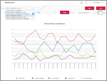The Device out of Policy by Day dashboard on the Overview screen provides a historical timeline of the policies. Whereas this dashboard is limited to a 30-day overview, the Dashboards screen allows you to specify various data views over a period of time. Click Dashboards from the menu or click the Devices out of policy by day line chart on the Overview screen.