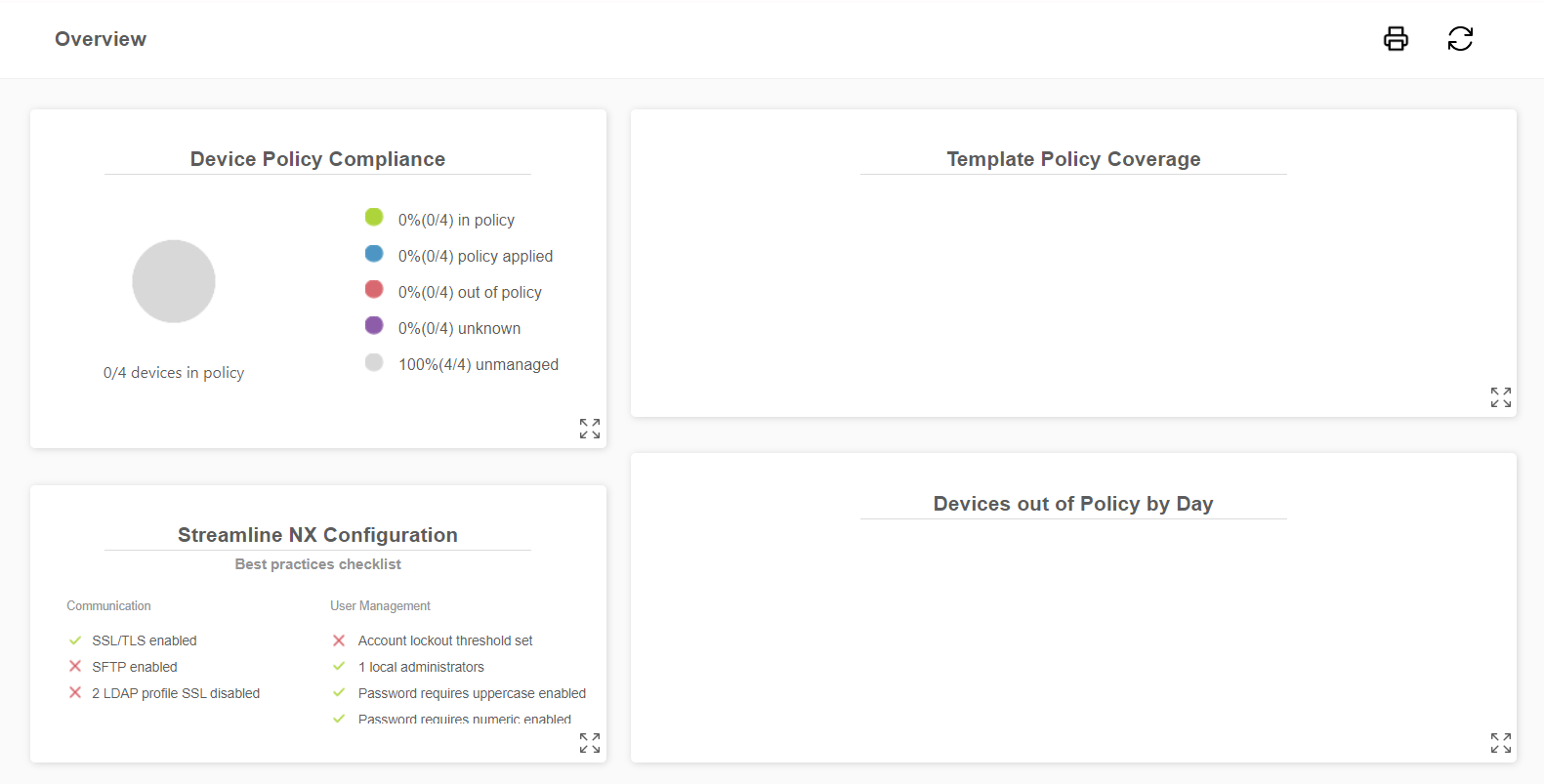 The Overview screen contains four unique dashboards. By default, all four dashboards are presented in 2x2 grid format. However, you can click the Resize