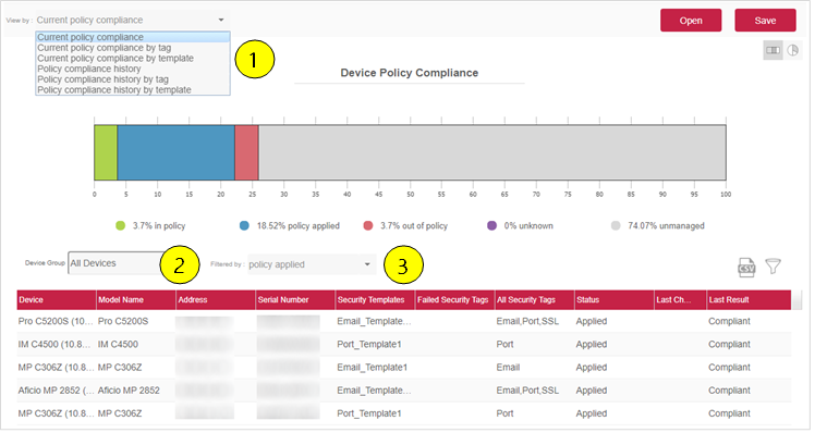 This dashboard view presents a bar graph that breaks the device policy compliance into states. You can filter the data based on: