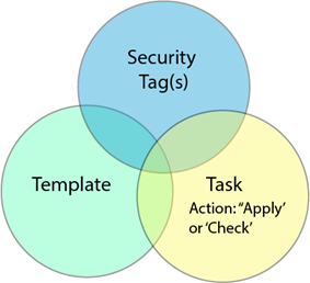 A policy is comprised of a template, one or more security tags, and a task that has run with either the ‘Apply’ or “Check” option.
