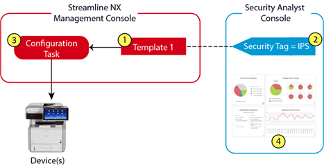 The diagram below depicts the workflow shown above, mapping the tasks that you must perform in Streamline NX vs those done in the Security Analyst console.