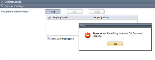 If you enabled a Document Tray as the destination type or if a File Cabinet is not selected (in General Settings), an error message displays indicating the problem when you click Add.