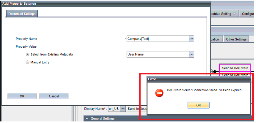 This error message occurs if you have not made any changes within the Management Console over a period of time and the connection to the DocuWare Server is therefore interrupted. Click OK to close the message, and then return to the General Settings screen and click Test Connection to reinitialize the connection to the DocuWare server.