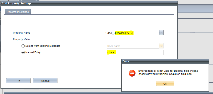 This error message indicates that you provided a different date format into the Manual Entry text box than the type specified for the selected Property Name in the Document Settings screen.