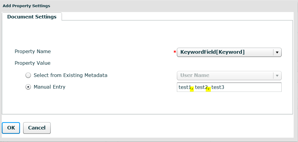 This feature allows the user to enter more than one Keyword at the MFP. When KeywordField is the selected Property Name, enter test 1, test 2, test 3 in the Manual Entry text box to allow users to enter multiple keywords.