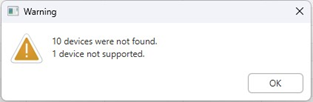 The Tool confirms the device models supported and their minimum versions required by comparing the devices against the firmwareVersion.txt file located in the C://Program Files/Ricoh/cbridgeDeployment/firmwareVersion subfolder. If the device is not a supported model OR if the device is not reachable, a Warning message is shown. You can view the Trace Logs in the C:\ProgramData\Ricoh\cbridgeDeployment\tool_log folder.