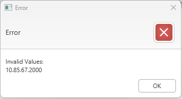 If a problem is detected with any IP address or subnetmask values in the CSV file, a notification is provided. You must fix the value before you can proceed. The entire CSV file must be validated; otherwise, NO values are imported.