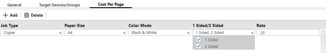 All copied pages are counted as one-sided when the cost is calculated because an insufficient number of attributes can be obtained regarding the sides for each page. Therefore, set both [2 sided] AND [1 Sided] for copy jobs on the [Cost Per Page] tab in [Pricing Table]. Refer to Pricing Table for instructions. The screen capture below depicts the addition of the Pricing rule for built-in copy jobs.