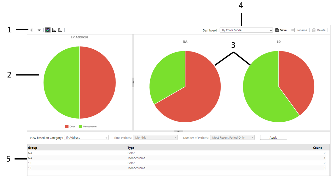 This displays the main graph of the selected dashboard. Depending on the setting, the graph may appear as a pie chart, vertical bar graph, horizontal bar graph, or line graph.