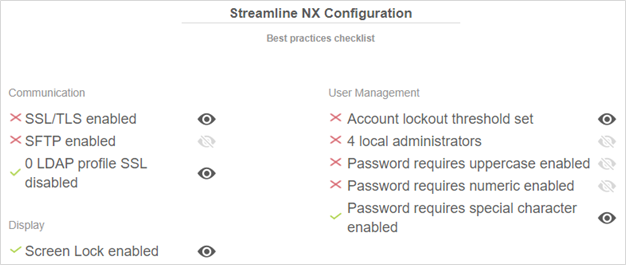 To ensure Streamline NX is fully secure, Security Analyst retrieves key server security settings from the Streamline NX Core Server and provides a ‘report’ about which settings are enabled and those that are disabled. The list is a guideline for the specific options that can make your Core server more secure.