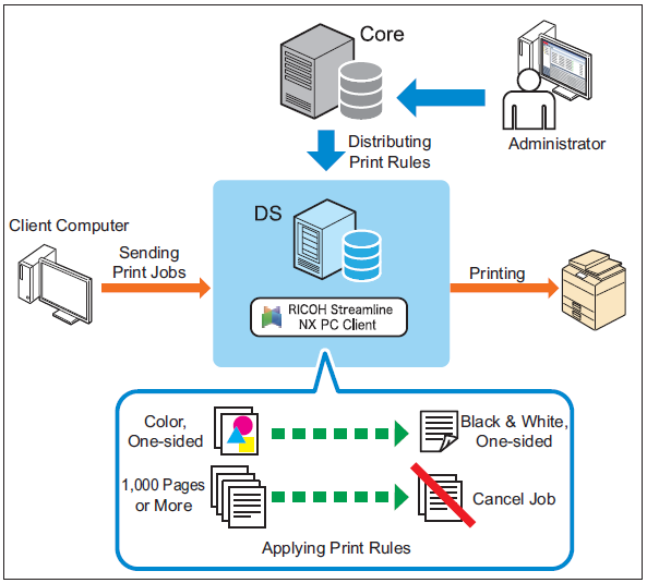 The Print Rules automatically modify print job settings sent by users to enforce printing policies defined by the administrator. The Print Rules are configured in advance by the administrator in the Management Console according to the operation purpose. The configured Print Rules are distributed to Delegation Servers and SLNX PC Client, and these are applied upon receiving a print job or releasing a secure print job.