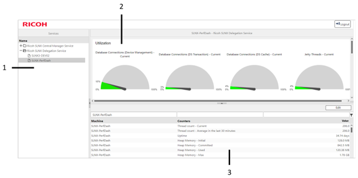 When a server is selected in the Navigation pane, the performance counter data of the selected server is displayed in customizable graphical widgets