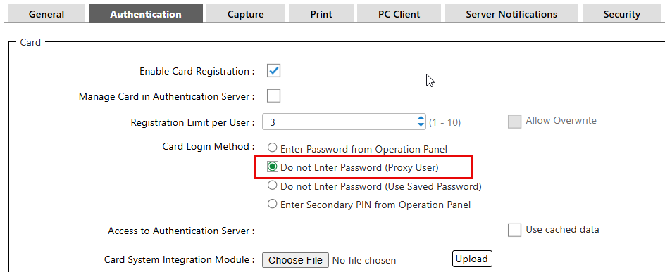 On the Authentication tab, enable the setting 'Do not Enter Password (Proxy User)', located under the Card Login Method options.