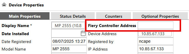 2. On the Main Properties tab, enter the address of the Fiery in the "Fiery Controller Address" field.
