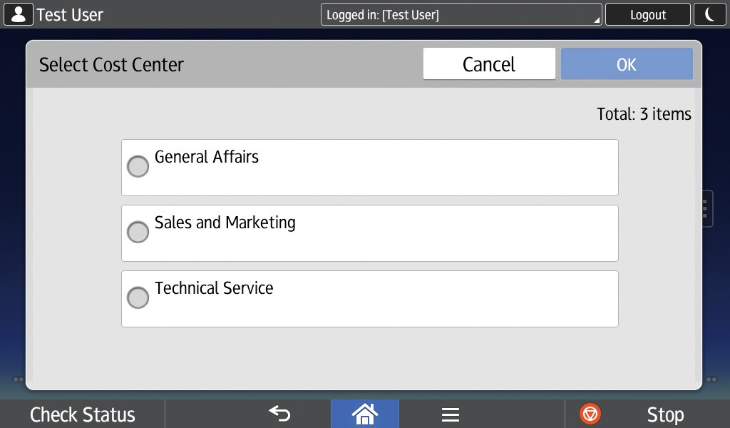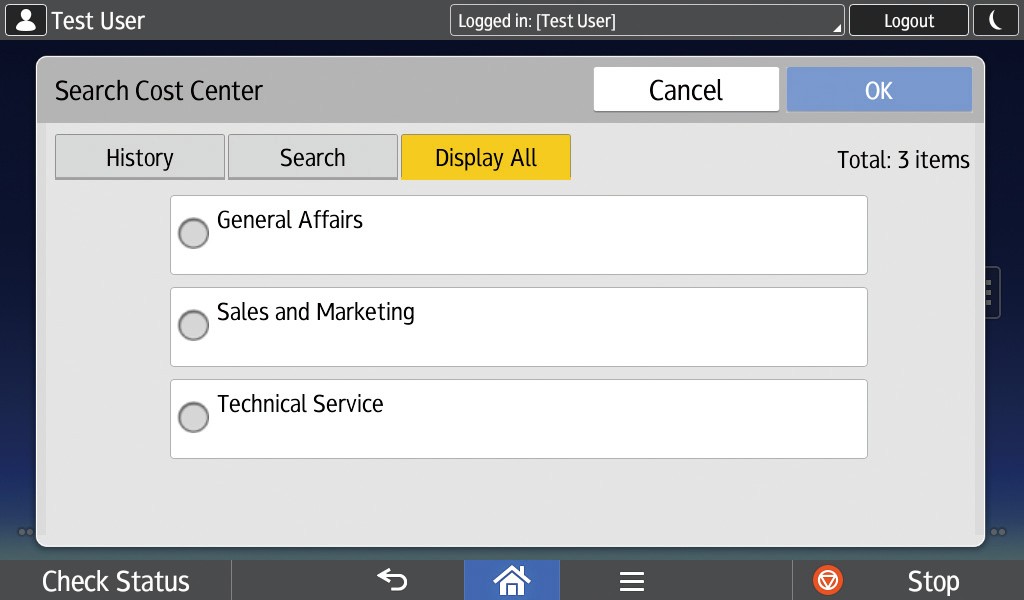 After the administrator configures cost centers, the Cost Center selection screen is displayed after login. You can select the cost center for all print, copy, scan, and fax jobs. The cost center information is saved in the database, and the document output cost is assigned.