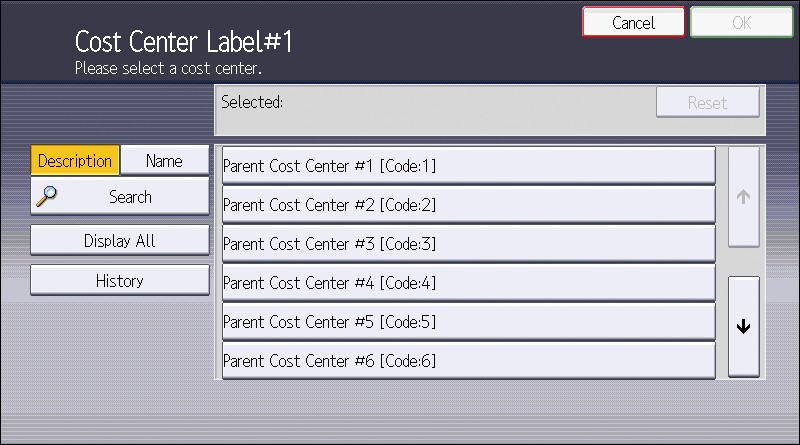 Example of Cost Center search screen (when using the Standard Operation Panel)